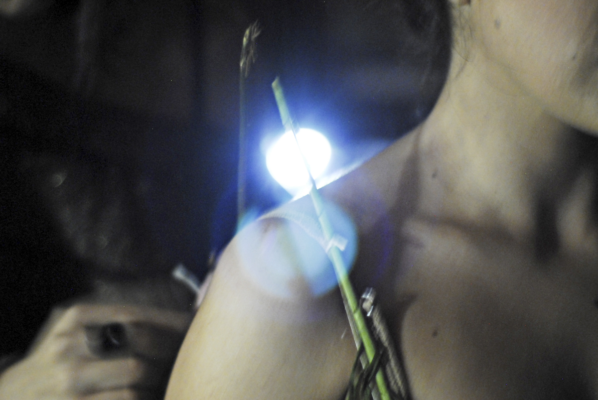 Foi por esta razão que levamos para lá uma ação longa, lenta e introspectiva. Com materiais orgânicos, a performer Ana Ferreira costurava, amarrava e colava o figurino no corpo da outra performer, Jossane Ferraz, que permanecia em repouso.